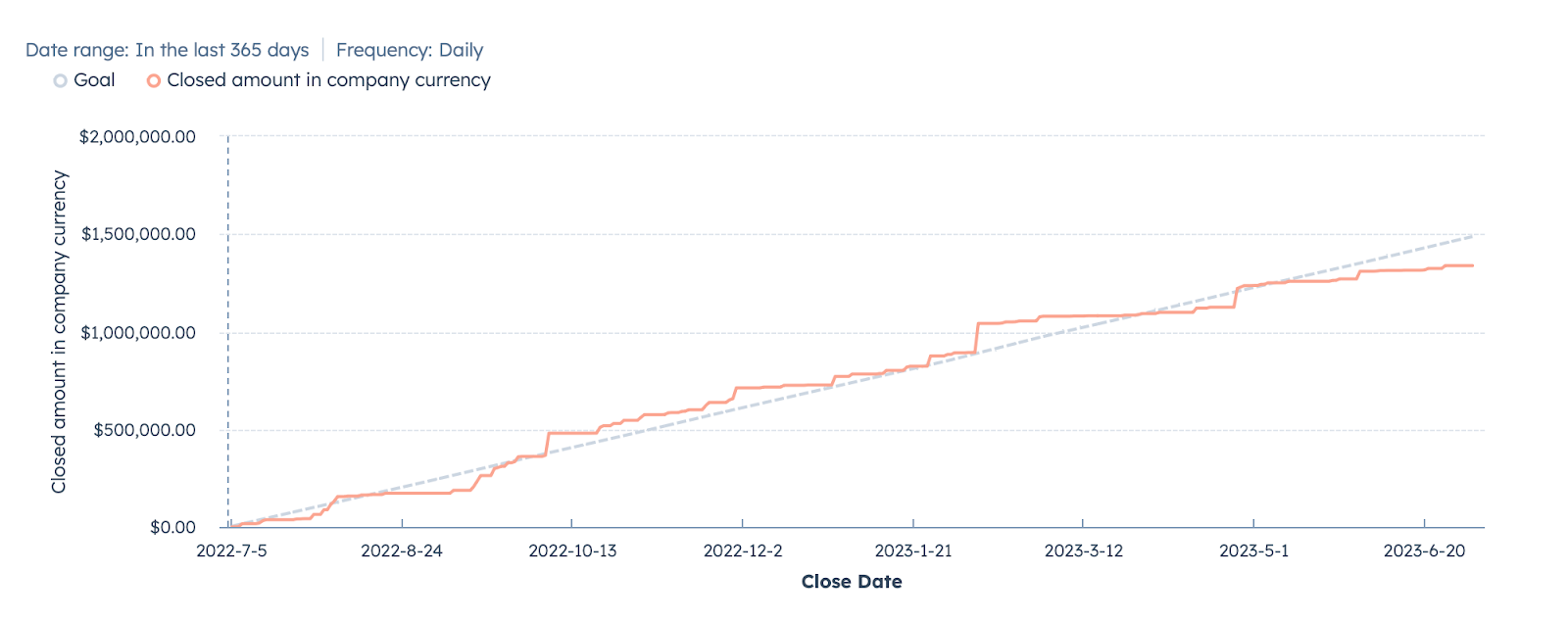 Within HubSpot’s sales reporting tool, you can choose to share this tracker with your entire team or keep it private to just your sales managers. Sharing with the team can motivate your reps to keep pushing toward those company goals. If you choose to keep it close to the chest, encourage your team members to create their own tracker where they can see personal progress toward their individual benchmarks and goals.