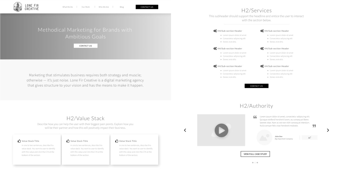 For example, it’s easy for something as simple as a color or photo in your design to influence the feeling of an entire web page. These details can muddy people’s understanding of the goal of a page and make it difficult to see how the sections help the user. This is why when we wireframe, we always use grayscale colors and image placeholders so our clients aren’t distracted by small details. It helps them to see the overall goal of our proposed design and allows them to provide feedback on how we’ve structured narrative content that’s relevant to the customer journey.